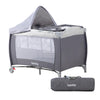 Cuna desmontable y plegable, guardarla en su bolsa de transporte incluida; además, muévela con sus ruedas integradas. Incorpora un cambiador de pañales y dosel redondo con un mosquitero que ofrece una vista clara del bebé, mientras lo protege de picaduras de mosquitos.